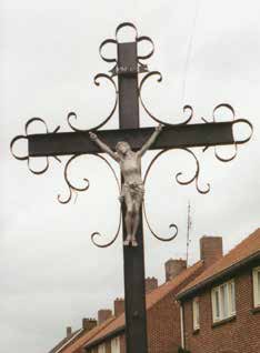 Omstreeks 1885 plaatste Frans Stappers (bijgenaamd Geele Frans) een houten kruis met een houten corpus op een driehoekig stuk grond aan het begin van de Eelserstraat vanaf de Kanaalstraat gezien. Hij woonde tot 1895 in de Beringerhoek en vertrok toen naar Baarlo. In 1915 werd het houten kruis met corpus vervangen door een ijzeren exemplaar met ook een ijzeren corpus. Dat kruis was gemaakt door Piet Hoebers, dorpssmid in Panningen. Het kruis kwam op een gemetselde voet te staan, verwezenlijkt door metselaar Engelbert Verstappen uit Beringe en bekostigd door de broer van Frans Stappers, Jacobus Stappers (bijgenaamd Martes Kubke) uit Panningen en met steun van Hoekse bewoners.