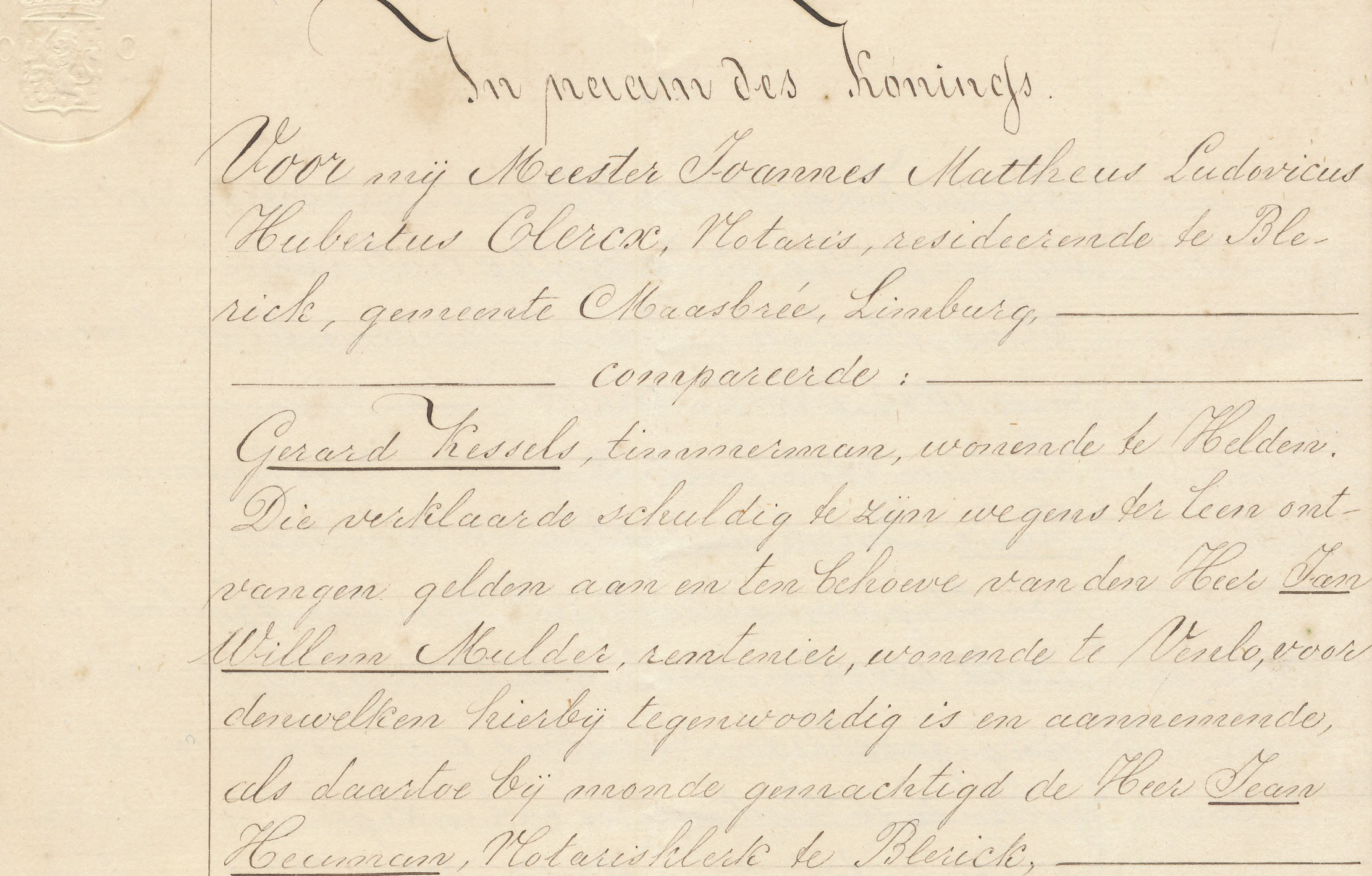 Op 23-02-1877 werd er een obligatie opgemaakt voor een lening van Jan Willem Mulder uit Venlo aan Gerard Kessels voor roerende goederen: