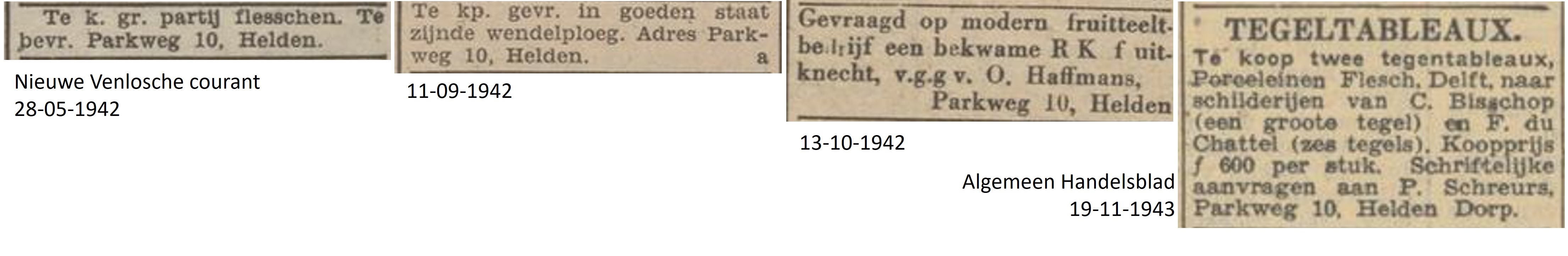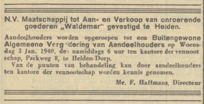 De gemeente Helden voert in 1939 straatnamen in en de weg naar Kessel krijgt dan de naam Parkweg. Het adres van Mr. F. Haffmans wordt dan Parkweg 8, waar tevens de N.V. Maatschappij tot Aan- en Verkoop van onroerende goederen "Waldemar" is gevestigd. De woning heeft dan twee huisnummers, Parkweg 8 en 10.