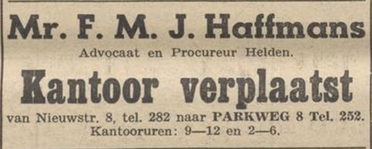 In het Dagblad van 15 januari 1951 kunnen we lezen dat Haffmans ook nog een kantoor had op de Nieuwstraat, dat dan "verplaatst" wordt naar de Parkweg. |