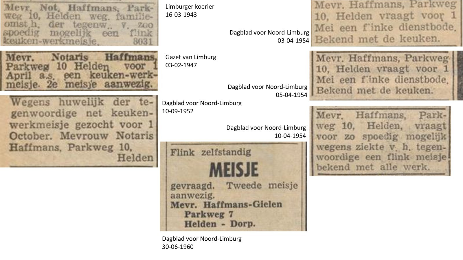 In die tijd is het een bewerkelijk huis en huishouden, getuige vele vacatures in de kranten naar (keuken)werkmeisjes en dienstbodes. Eind 1950-er jaren begint de gezinsuitbreiding en dit zal het huishoudelijk werk zeker niet verminderd hebben.