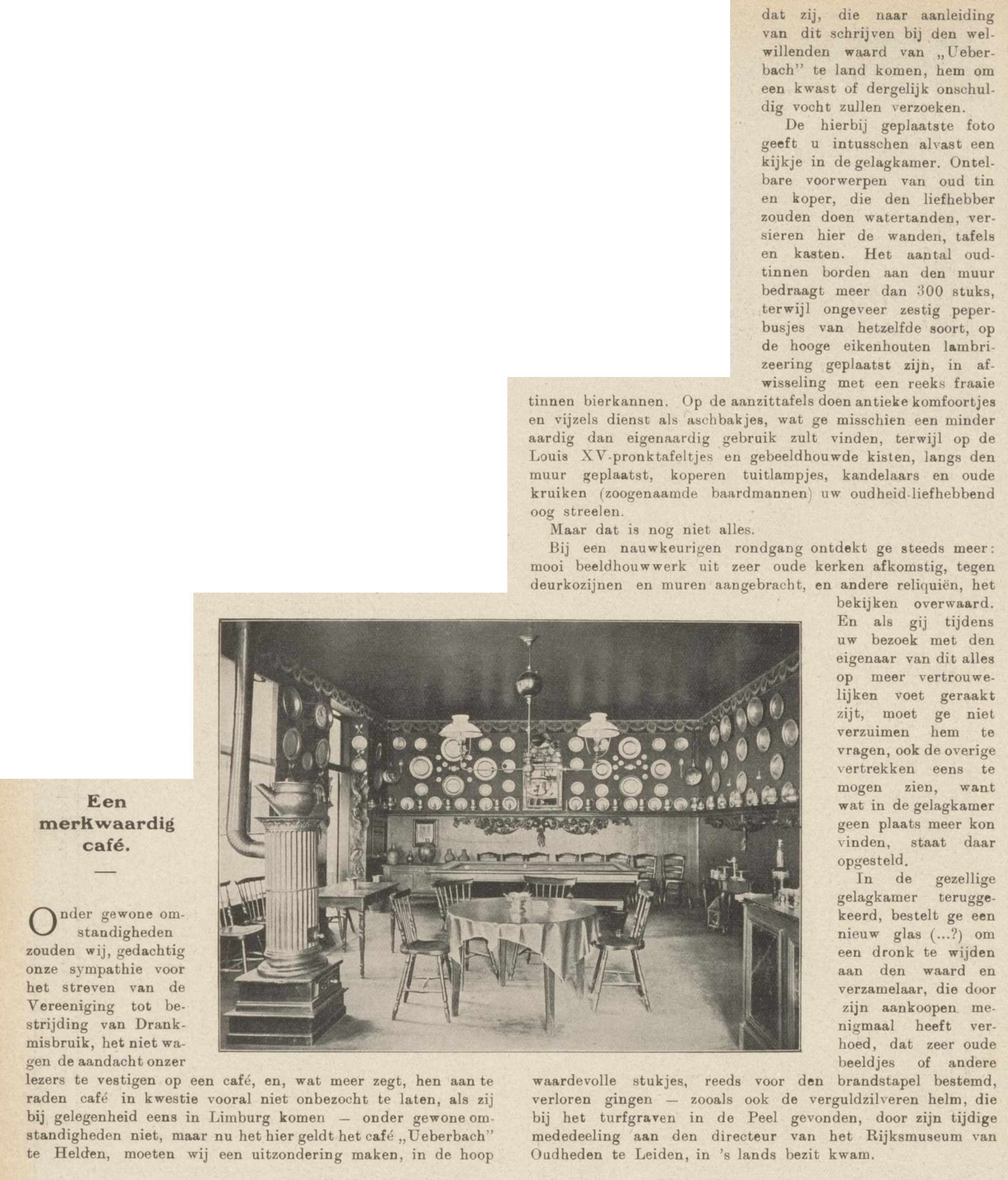 Jan Ueberbach was glazenmaker en "verver", maar in 1881 krijgt hij vergunning om (sterke) drank te verkopen en wordt er melding gemaakt dat Jan Ueberbach als beroep "tapper" heeft. Waarschijnlijk bedreef hij toen al enige tijd een café-bedrijf in één kamer rechts naast de bewoonde ruimtes. Mogelijk, maar niet zeker was er in 1882 ook een beugelbaan links van de woning.