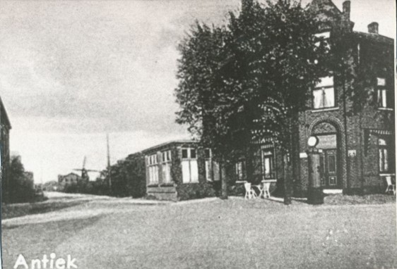 ![]() Hotel Antiek rond 1930 met zicht op de Molenstraat en op de achtergrond de molen en beneden richting de Pool. |