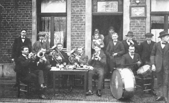 Foto rond 1915: Café A. Martens met boven de café deur het bordje "Logement en Rijtuigverhuurder".