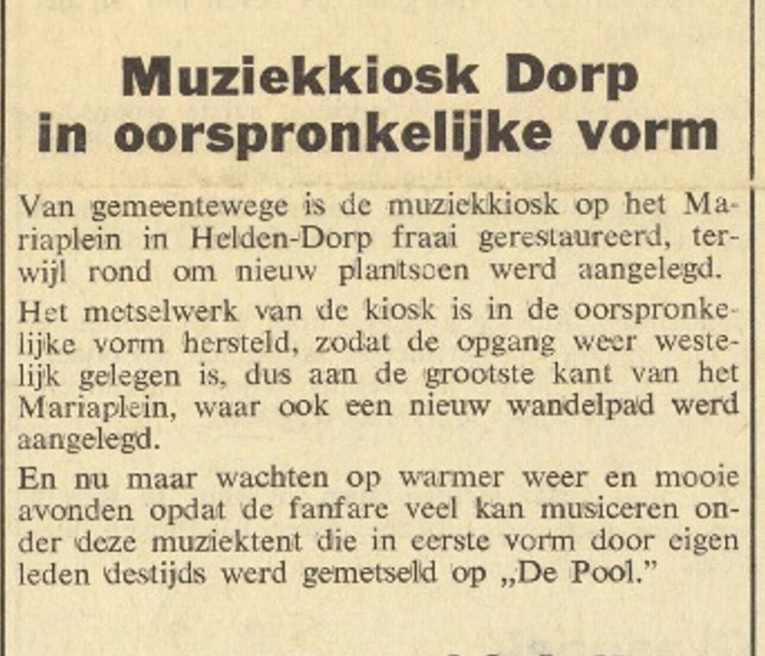 De Fanfare gaf in het begin van de 20ste eeuw hun concerten in de tuin van Haffmans (het huis van "de Koning") of op het plein "de Pool". Men besluit dan een verplaatsbaar kiosk te maken op de toenmalige Markt (volksnaam de Pool). Dit wordt helemaal door vrijwilligers gebouwd.