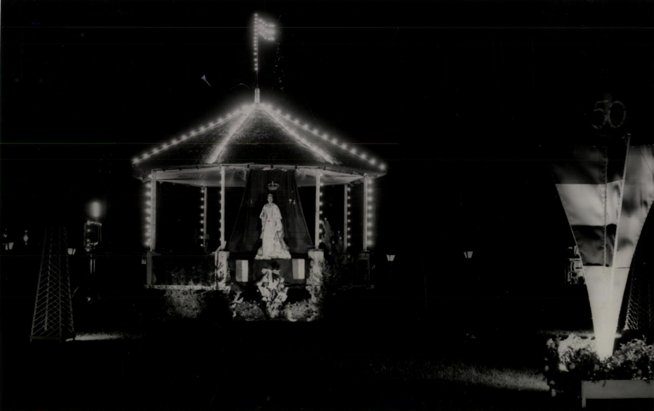 Verlicht kiosk op het Mariaplein in Helden Dorp, bij gelegenheid van de Koninginnefeesten 1948 rond de officiële troonsbestijging van koningin Juliana. Volgens de overlevering zongen de vele bezoekers spontaan en uit volle borst het Nederlands volkslied als hoogtepunt van het feest. |