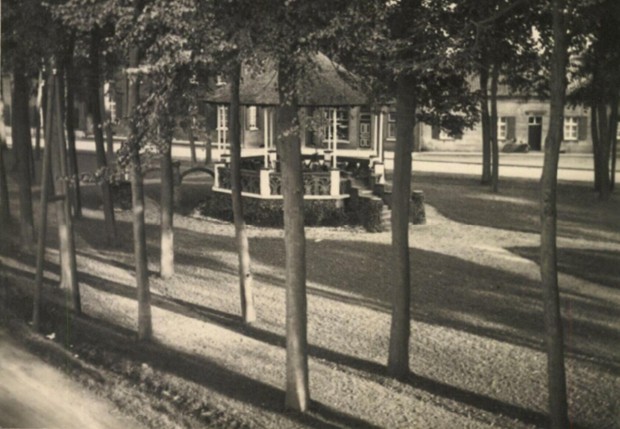 Het vaste kiosk, kort voor de tweede wereldoorlog. De dichte begroeiïng met de vele bomen zou grotendeels worden gekapt en ter plekke blijven liggen om het de Duitsers moeilijk te maken het plein te passeren. |
