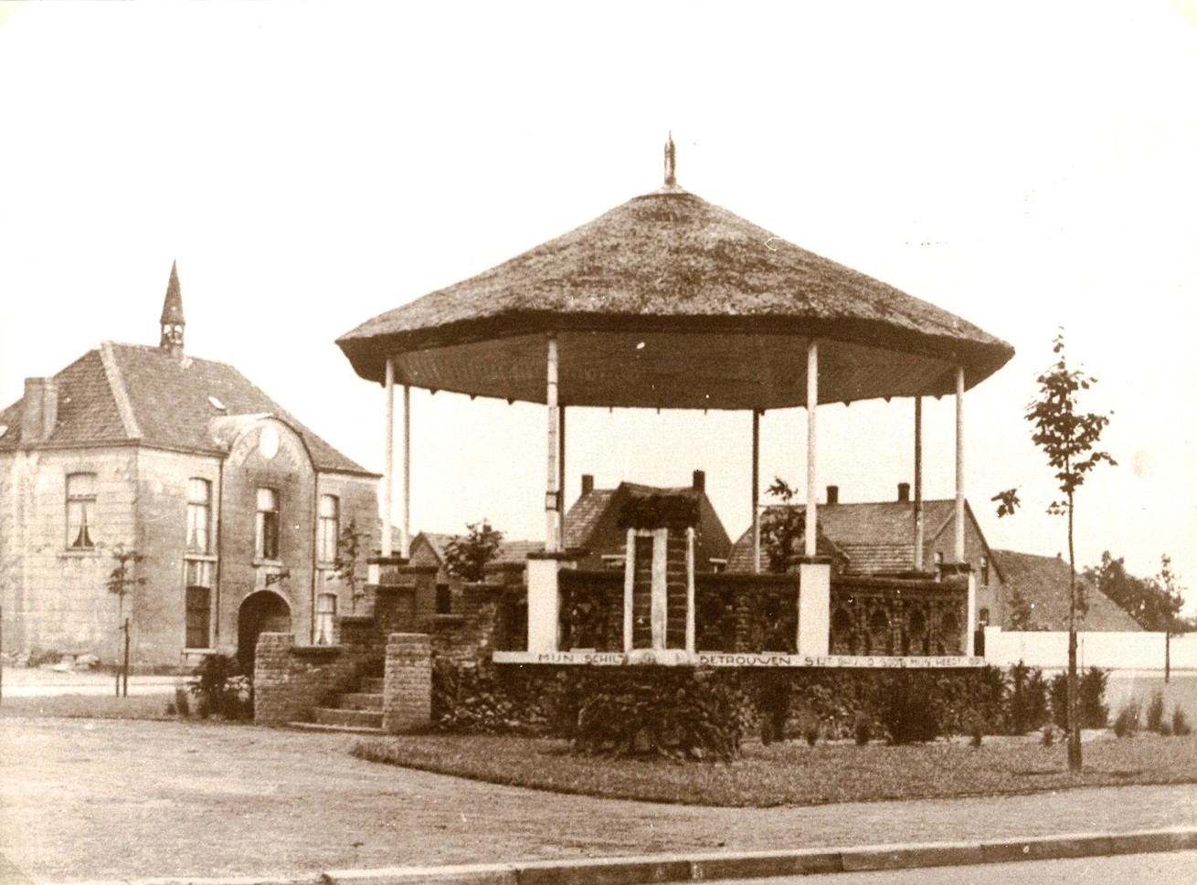 In september 1933 werd het kiosk officieel ingewijd, nog zonder dak. Het riet kwam er pas een jaar later op. De vrijwilligers kregen van dirigent Crijns allen een steen me naar huis, waarin men de naam moest beitelen. Deze stenen werden daarna rood of goud geverfd en in een zuil ingemetseld langs het kiosk.