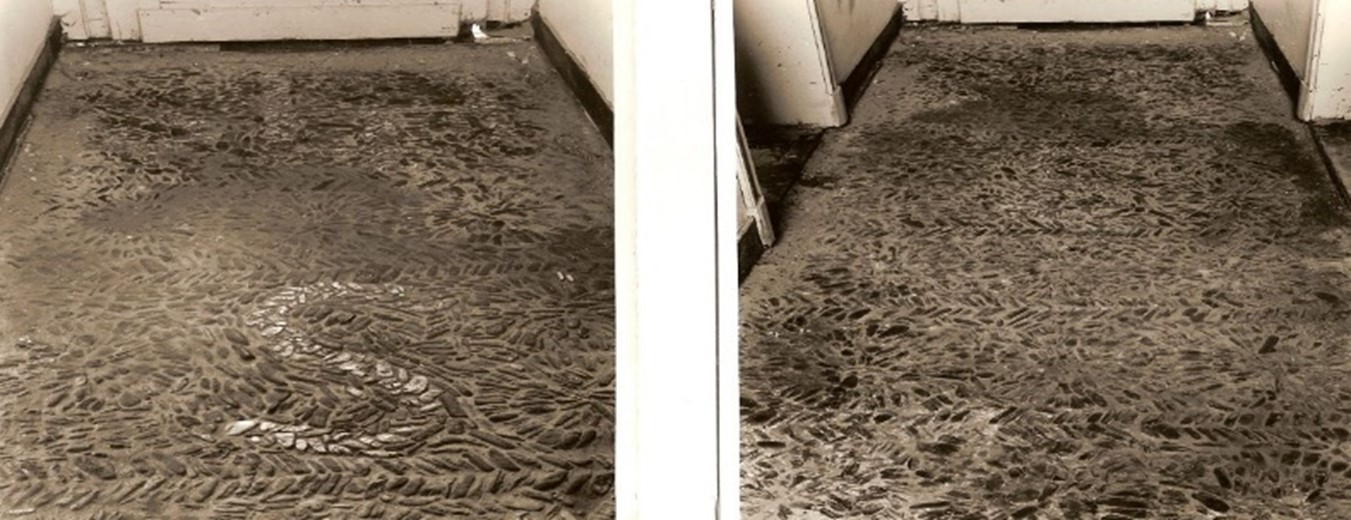 Tijdens de sloop werd onder de bestaande vloer een kiezelvloer ontdekt. Deze bestond hoofdzakelijk uit platte keien, in rozetten met een diameter van 45 cm gelegd. Deze rozetten vormen in onderling verband weer banen. Ook zijn er cijfers in aangebracht. Hieruit kon echter nauwelijks een jaartal ontcijferd worden. Wel was bij de voordeur duidelijk in witte steentjes I-H-S te lezen. Oudheidkundigen en onder meer het Openluchtmuseum in Arnhem zijn bezig geweest met deze vloer.