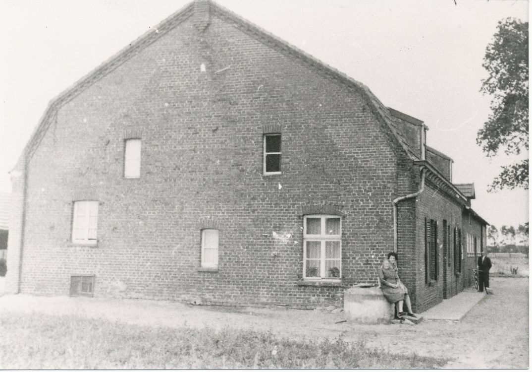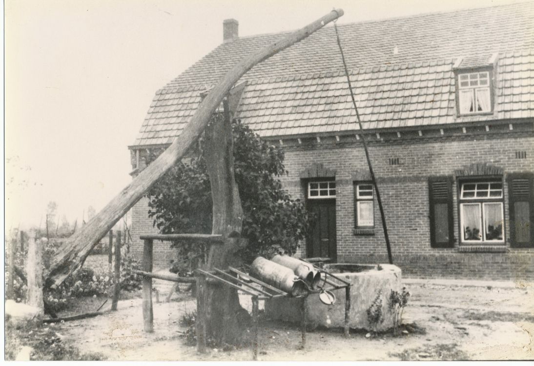 Op deze foto zijn de contouren van het oude dak nog zichtbaar. Op de put zit Petronella Hesen-Hillen en naast het huis is Sil Hesen. |