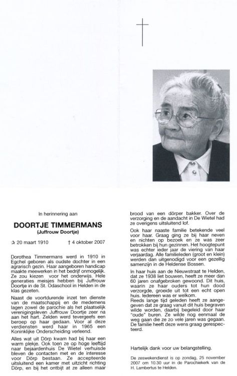 Daarnaast was Door Timmermans erg begaan met het maatschappelijke leven in Helden. In de eerste plaats heeft ze tot aan hun dood gezorgd voor haar ouders. Door goede contacten met burgemeester Cremers kreeg zij veel geregeld voor of met mensen in nood en de eerste gastarbeiders. In 1965 werd ze voor deze "open huis"-houding koninklijk onderscheiden.