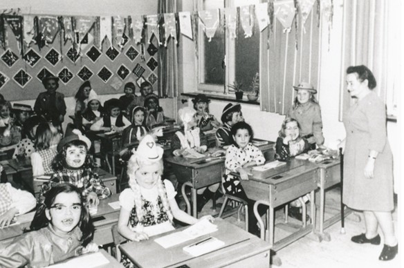 Juf Doortje voor de 1e klas van de Sint Oda-school. |