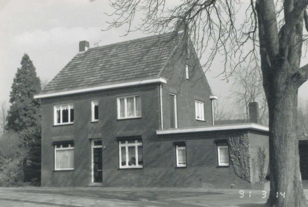 Vrijstaand sober woonhuis. Vensters en deur met strek en geglazuurde dorpelstenen, deur met beton dorpelsteen. |