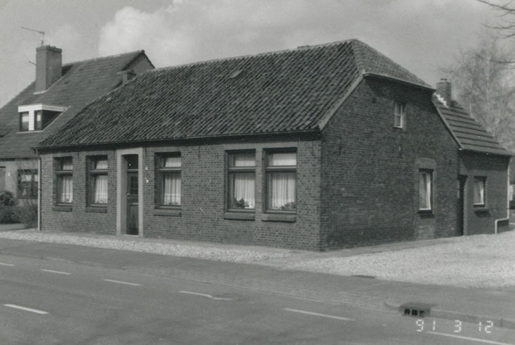 Vrijstaand sober woonhuisje. Asymmetrische indeling frontgevel. Deur frontgevel in gecementeerde omlijsting. |