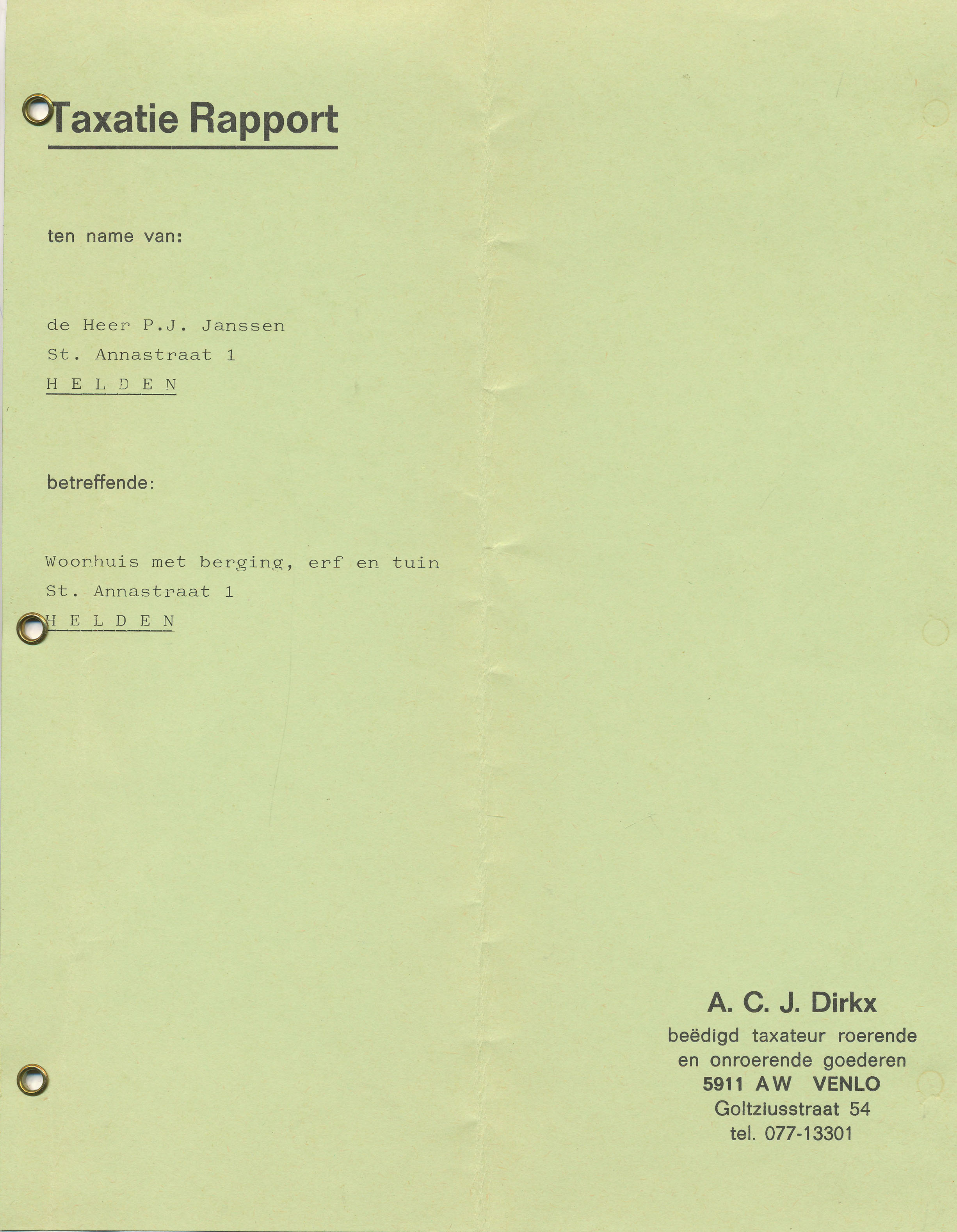Op verzoek van de Weledele Heer P.J. Janssen te Helden St. Annastraat 1 de verkoopwaarde te hebben gewaardeerd van het na te melden onroerend goed te weten: