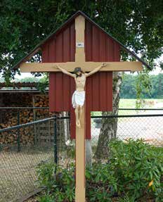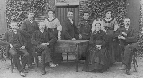 ![]() | Het veldkruis werd in 1917 geplaatst door Cornelis Bos (1850 – 1928, zittend, 2e van links) die getrouwd was met WilhelminaThijssen (1850 – 1912). Het stond eerst aan de overkant van de weg. Het zou geplaatst zijn als dank voor de genezing van een zieke dochter. Een ander verhaal is dat het werd geplaatst naar aanleiding van een ernstige ziekte van Cornelis. Op zijn bidprentjestaat namelijk dat hij verschillende keren kerkelijk bediend werd. |