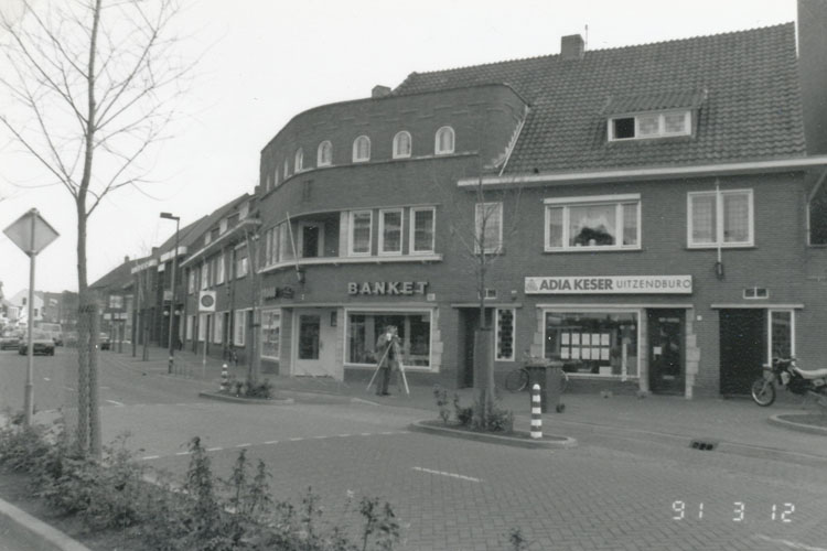 Markant breed hoekpand met winkels en woonhuizen. Asymmetrische gevelindeling vensters en deuren deels met beton lateien. |